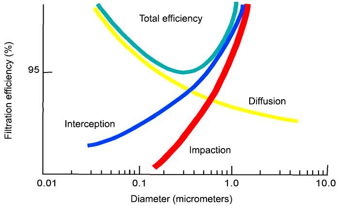 The filter media used in HEPA filters consists of intertwined fibers—typically glass fibers—that form a membrane capable of trapping particles. The diameter of a glass fiber ranges from 0.5 to 2 µm. By adjusting how the fibers are arranged within the filter, it is possible to capture particles smaller than 0.3 µm. Three distinct mechanisms are involved in particle filtration.