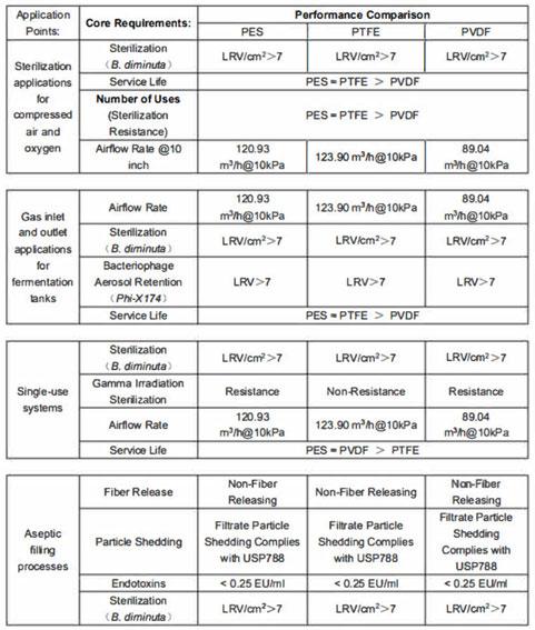 Ce tableau montre que les cartouches en Polyéthersulfone (PES) assurent une performance de flux d’air comparable à celle des cartouches en Polytétrafluoroéthylène (PTFE) et en Polyfluorure de vinylidène (PVDF). En plus de leur excellente résistance à la vapeur, ces filtres hydrophobes en PES démontrent une résistance aux rayons gamma équivalente à celle des filtres hydrophobes en PVDF, ce qui les rend particulièrement adaptés aux applications dans les systèmes à usage unique.