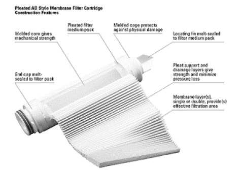 La membrane est donc plissée avant d’être insérée dans la cartouche, permettant d’obtenir des surfaces comprises entre 0,5 m² et 0,7 m². Cette surface reste bien entendu le facteur limitant du débit. Les médias les plus couramment utilisés sont le Polyethersulfone, le Nylon 6.6 ou le PVDF. L’épaisseur de ces membranes se situe entre 150 et 300 μm.