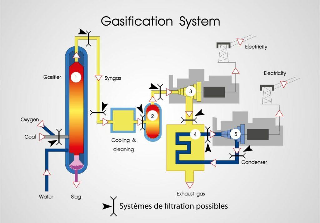 La filtration des déchets solides présents lors de la gazéification intervient à différentes phases de la production. Elle met en oeuvre des dispositifs de filtration qui dépendent du stade du processus où ils interviennent et du procédé utilisé (gazéification du charbon intégrée à un cycle combiné, combustion de lit fluidisé pressurisé, valorisation de granulés de biomasse ou de déchets municipaux solides, etc.)