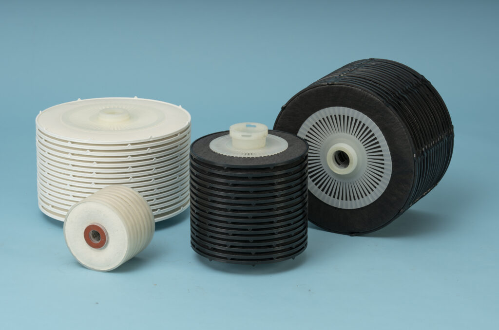 Les cellules ainsi constituées sont empilées les unes sur les autres, pour former un module lenticulaire de la hauteur souhaitée. Des adaptateurs fixés à l’axe central donnent de la cohérence à l’ensemble en maintenant chaque cellule dans sa position. Cette géométrie permet de maximiser la surface filtrante dans un volume donné. L’ensemble est enfin placé dans un carter de filtration étanche dont les dimensions sont adaptées au diamètre (8, 12 ou 16″ classiquement) et à la hauteur du module lenticulaire.