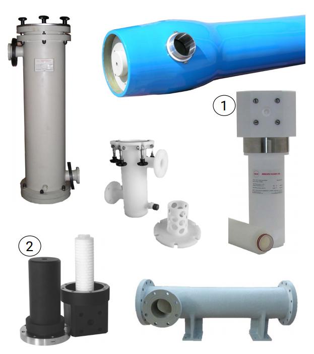 Lorsque les équipements de filtration sont plus volumineux (filtres multipoches pour la rétention des fines de charbon, rétention de catalyseurs etc.), on peut utiliser des polymères standards (PP, PVDF) ou des composites thermodurcissables comme le GRP (Glass Reinforced Plastic) aussi appelé SVR (Stratifié Verre Résine).