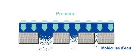 Lorsque la pression est inférieure à celle du point de bulle, les molécules de gaz se déplacent à travers les pores remplis d’eau d’une membrane mouillée, suivant la loi de la diffusion (loi de Fick). Celle-ci stipule que, pour un filtre donné, le débit de diffusion proportionnel à la pression appliquée et à la surface totale du filtre.
